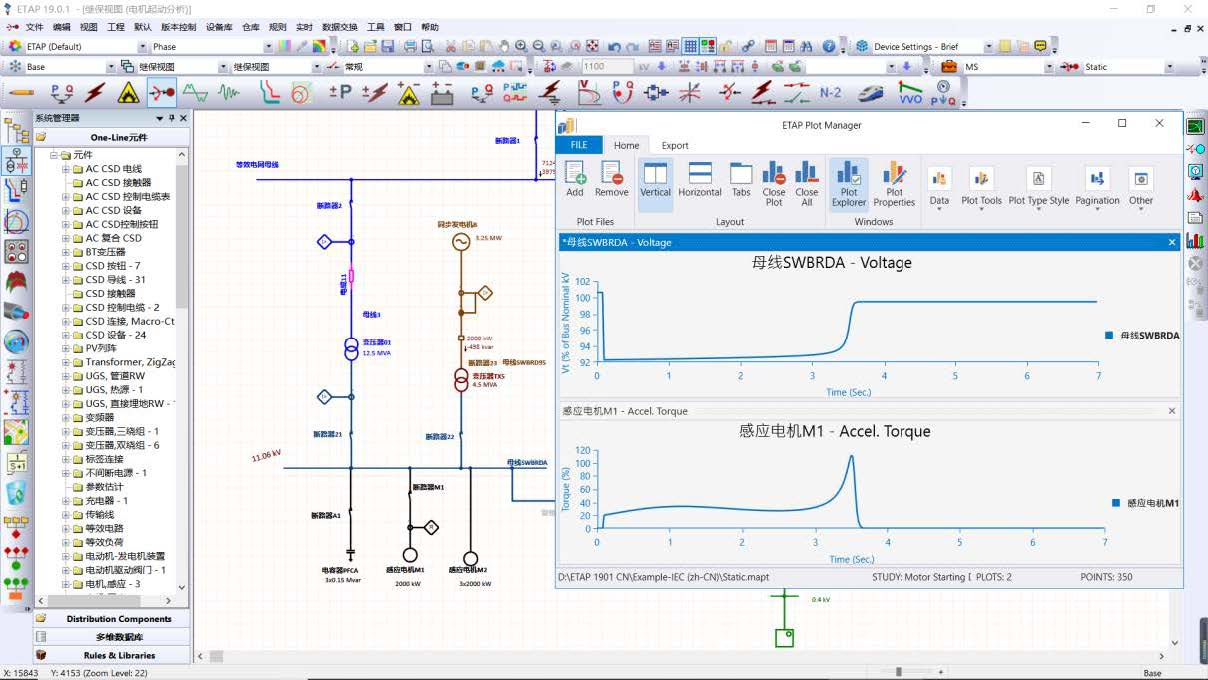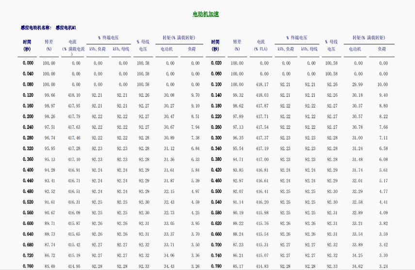在电机起动期间,正在起动的电机对于系统来说就像是一个连接在母线上的小阻抗负荷。它从系统中吸取很大的电流,使系统产生电压降,并对其它系统负荷的正常动作产生干扰。因为电机加速转矩由电机终端电压决定,所以很多情况下,正在起动的电机由于终端电压较低而无法达到额定速率。这就使电机起动分析变得尤为重要。电机起动分析的目的有两个:分析电机能否在运行条件下成功地起动,另一个目的是看电机起动时是否严重的阻碍了系统中其它负荷的正常运行。
