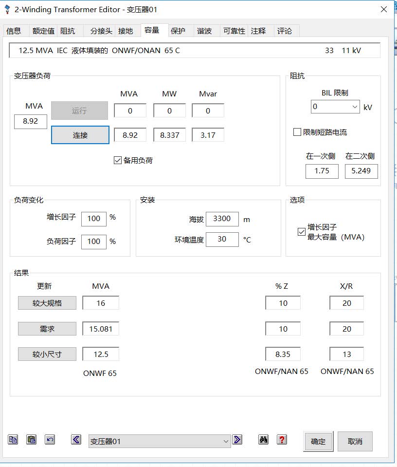 ETAP 已经将包含在标准ANSI/IEEE C57,IEC 60076-2 & 60726上的信息编译到一个特定程序中,它可以方便地决定一个电力变压器合适的容量。该程序使用的方法考虑了多种因素,包括周围温度、海拔高度、冷却方式和类型(干式或液体填充)。当设定一个变压器的容量时,考虑到它所需负荷未来期望的增加也是非常重要的。容量估计确定程序使用调整因子来考虑以上因素。此外程序也考虑了变压器的短路要求,即变压器阻抗和基本脉冲级别( BIL)。该程序已经完成了比较计算得到的容量和阻抗和标准推荐的最小值之间的差别的功能。