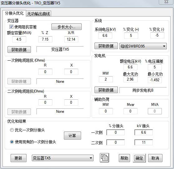 ETAP变压器分接头优化模块的目的是基于ANSI / IEEEC57.116-1989标准优化发电机组变压器抽头的比例。此变压器的优化分析模块,用于确定变压器最佳分接头(匝数比),使电力变压器能够在预期的系统中,提供最大无功输出范围和发电机的工作电压变化范围。此变压器的优化分析程序也可以为给定的变压器分接头设置(匝数比)用来检查无功传递的范围。