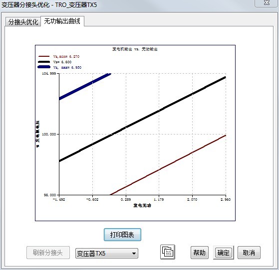 无功传递曲线页面显示变压器分接头优化计算的一个图形格式结果。该图形描述了发电机电压与发电机的无功功率输出。这种格式也被称为发电机的无功功率(无功)的传递能力,因为它显示了发电机在计算变压器分接头和系统的工作电压的无功功率输出范围。下图包含在三个不同的系统工作电压下的三个传递曲线。第一个电压是实际系统的额定电压,而其他两个图是基于在编辑器中所指定的电压变化(最大值和最小值)。