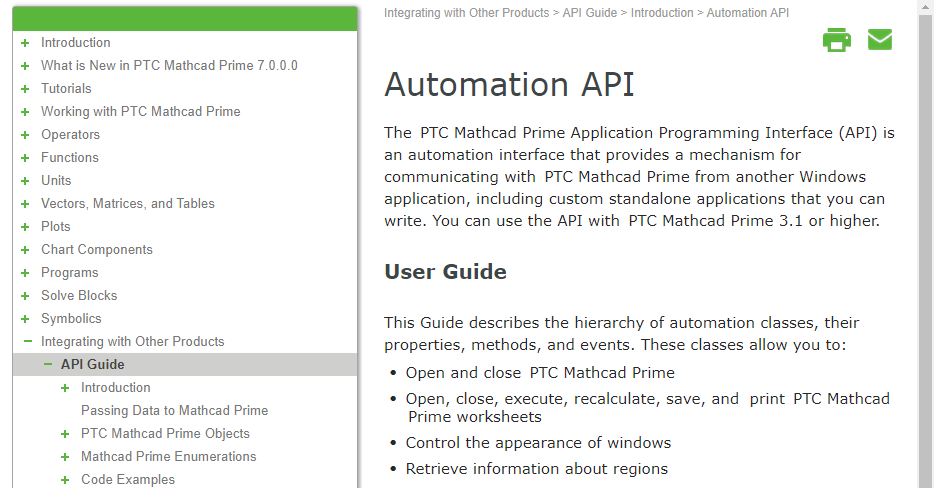 PTC Mathcad 包含的 API 可用于将 Mathcad 与其他支持 API 的第三方应用程序无缝集成。这是您可以使用 PTC Mathcad 中提供的 API 命令来打开工作表、更改变量、运行计算、获取和保存结果。为了更高效地使用 API,请参考 PTC Mathcad Prime 7“帮助”中包含的新 API 指南。该指南介绍了 API 中所有的可用命令,此外还提供您可以自己编译和运行的可下载示例。